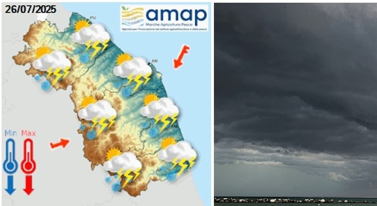ANCONA – Temporali diffusi, locali grandinate e temperature in deciso calo, anche di 7-8°. Godiamoci ancora questo scampolo d’estate, garantito fino a domani dallo scudo anticiclonico che protegge il Centro-sud dell’Italia, perché da sabato prossimo 26 luglio il quadro meteo sulle Marche è destinato a mutare decisamente, interrompendo una fase di caldo africano che durava da quasi due settimane, con temperature massime di 38-39° C all’ombra.