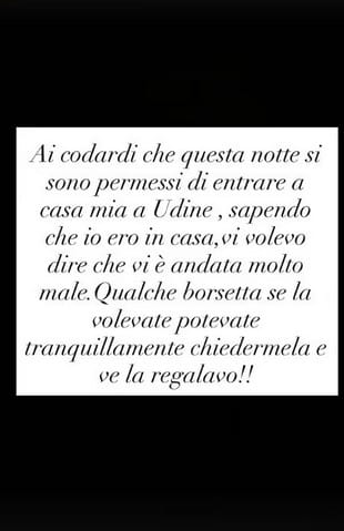 L’attaccante dell’Udinese ha raccontato in una storia pubblicata su Instagram di aver trovato la casa svaligiata. I ladri sono entrati tra sabato e domenica, dopo la sconfitta con il Parma: “Ai codardi che questa notte si sono permessi di entrare a casa mia a Udine, sapendo che io non c’ero, volevo dire che vi è andata molto male”, ha scritto.